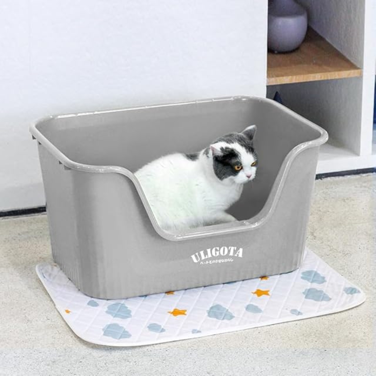 ULIGOTA 超大型猫用トイレ オープンタイプ 大きい猫 多猫 本体 簡単掃除 清潔 飛散防止 一体成形 幅64×奥45×高33cm【入り口までの高さ】14.4cm ライトグレー