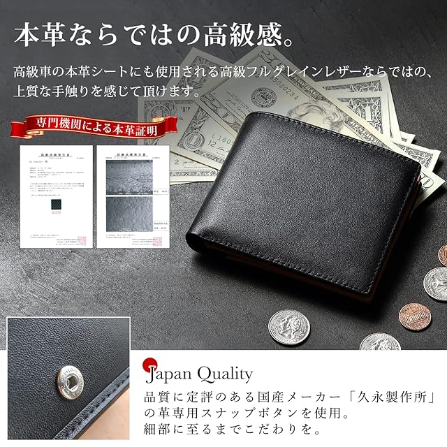 【高級フルグレインナッパーレザー本革財布】外側には高級フルグレインレザー、内側には高級合皮マイクロファイバーレザーを使用。耐久性・耐摩耗性の高さで、上品かつ高級感を保ちながら長くお使い頂くことが出来ます。