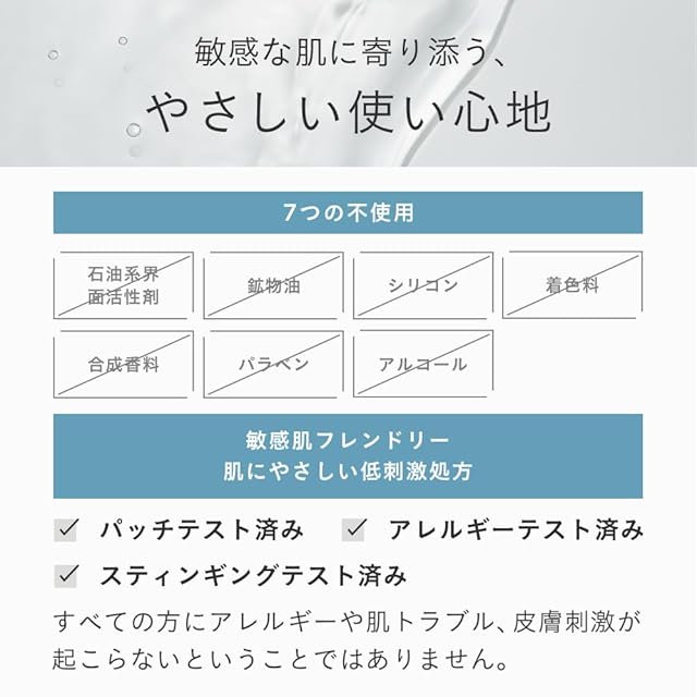 シリコン、パラベン、石油系界面活性剤、鉱物油、合成香料、タール系色素は不使用。 肌にやさしい低刺激処方。さまざまな肌質の方にご使用いただけます。
