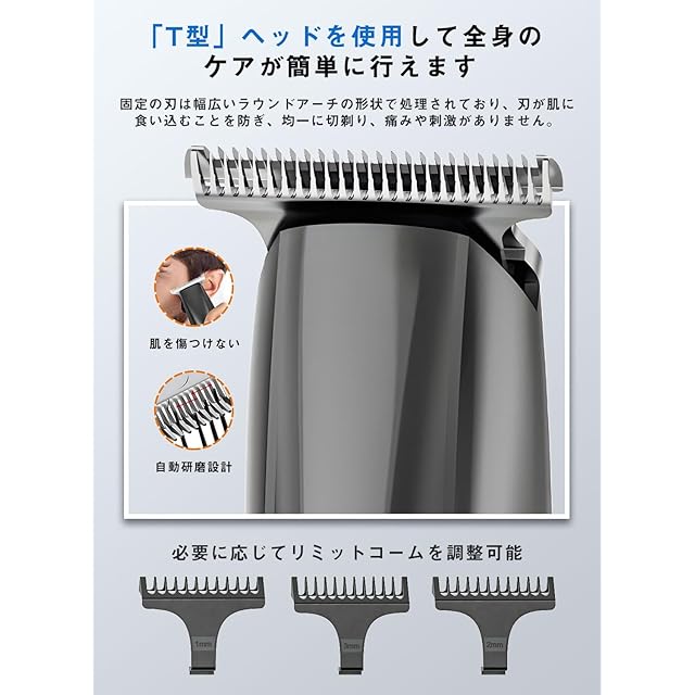 i型カッターヘッドデザイン: 独特な「I」字型のブレードヘッドを使っており、体のトリミングしにくいエリアをきれいに整えて、例えば:鼠径部や大臀筋です。鋭くて安全なカッターヘッドは。本製品は強いモーターにアップグレードして、バッテリー容量を増やして、製品のチップを最適化して、使用時間がもっと長くなり、省エネになりました。本体的にも簡単にメンテナンスすることができます。T字トリマーは付属のアタッチメントを取りつけて、毛の長さを調整できます。本体は環境にやさしくて耐用なABS樹脂を採用して作られており、いつでもどこでも自信を持ちましょう。
