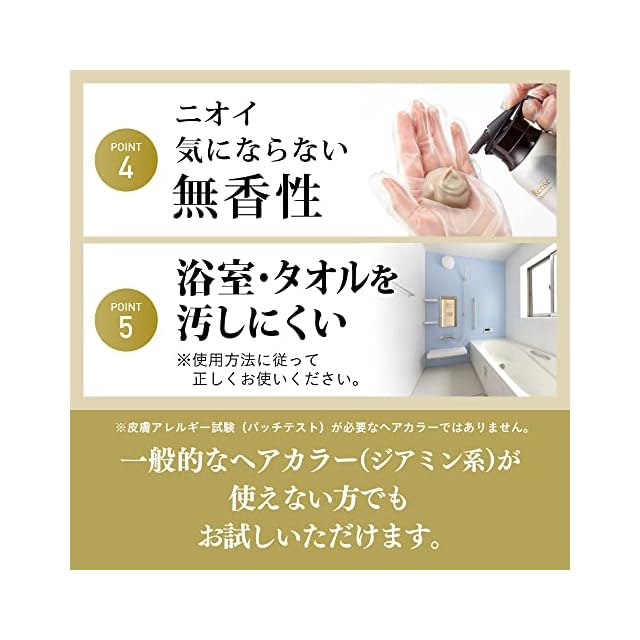 【おふろで簡単! 髪に塗って、5分で流すだけ】 頭皮や肌に着色しにくく*3、お風呂も汚れにくい*4。 ツンとしたニオイがない無香性。 *3当社ブローネヘアマニキュアとの比較 *4 材質により剤が落ちにくい場合があります