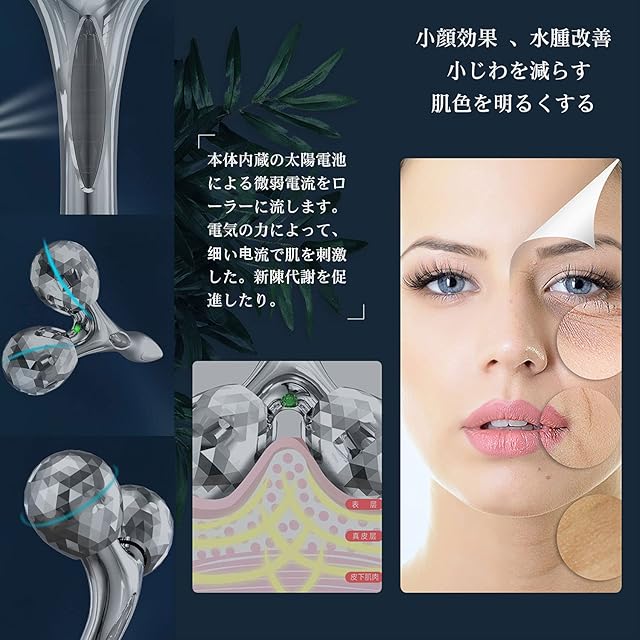 【微電流式美容ローラー+(ギフトT字型の目元エステ)】充電不要式、ハンドルに設けられたソーラ一パネルから光を取り込み、微弱電流「マイクロカレン卜」を発生させます。 充電不要、パネルから光を取り込み、微弱電流「マイクロカレン卜」を発生させできます。電気の力によって、细い电流で肌を刺激した。新陳代謝を促進したり。むくみ、ハリ、しわの消去に効果もあります。また、肌のハリが生まれるなどの効果も得られます。製品はソーラーパネルを介して微弱電流を発生させることができます。微弱電流を人体に作用させることができ、非常に弱いので、肌が感知できません。T字型の目元エステ、しわやたるみ、くまなど目のこりや血行をよくしたい方に。そのため、疲れ目の改善に効果的です。