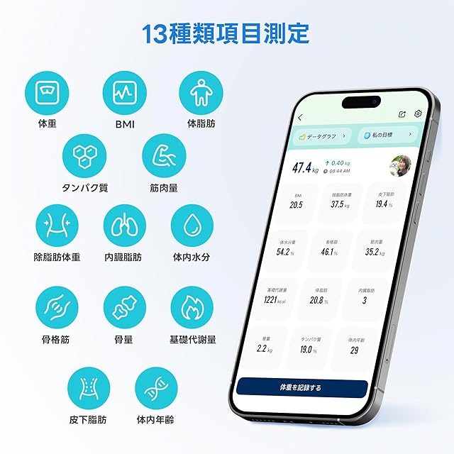 測定項目:13種類 登録人数:無制限 自動認識