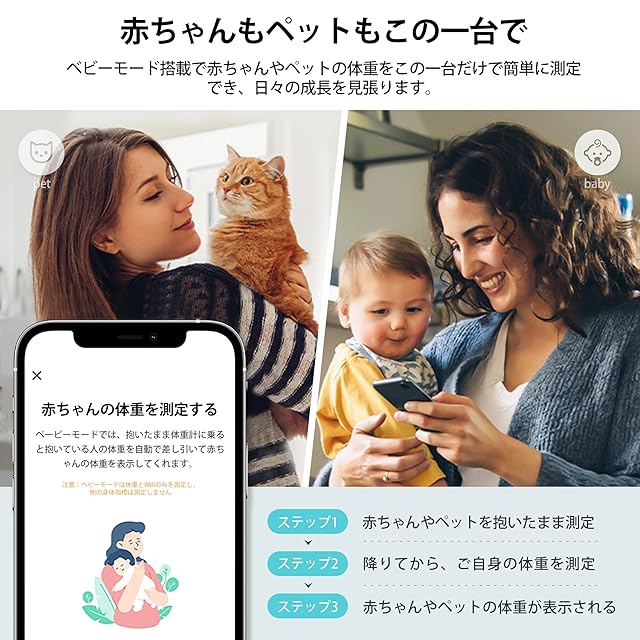 ご注意:固く平らな床の上でご利用ください。足が乾燥しすぎたり、湿りすぎたりすると、体脂肪など他の指標の測定に影響を与えることにご注意ください