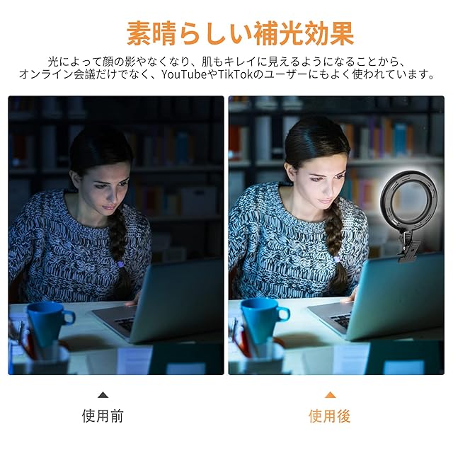 【多場面適用】インタネット時代では、オンラインミーティング/面接/授業、ライブ配信、Line通話の機会が増えており、明るすぎたり暗すぎたりすると目に負担がかかります。こちらのオンライン用ライトは柔らかな照明で目を保護、紫外線による肌へのダメージを減少、長時間使用してもお体に危害が出さない。電子機器をよく使う人にとっては持っておいて損はない商品だと思います。クリップ式+三脚なのでどこでも使え、リモート用ライトとしてだけでなく、自撮りライト、女優ライト、生放送用ライトとしても最適、いろんな場面でしっかり照明。