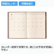 【商品説明】「書く」ことを第一に考えた記入スペース充実のシンプルダイアリーメモページがノート1冊分あり、手帳とノートを一括管理したい人におすすめです。カバー前側には3段名刺ポケット、カバー後ろ側には名刺ポケット・ペンホルダーがついています。【月間ページ】見開き1ヶ月のベーシックなブロックタイプ(月曜始まり)。カレンダーと同じような感覚で見ることができ、週ごとの予定が把握しやすいのが特徴です。【週間ページ】上部のスケジュール欄(月曜始まり)で予定を把握しながら、たっぷりの方眼メモスペースはノートのように使えます。手帳とノートを一元管理したい方や自由にカスタマイズしたい方におすすめです。モデルチェンジ:●扉のデザインを変更しました