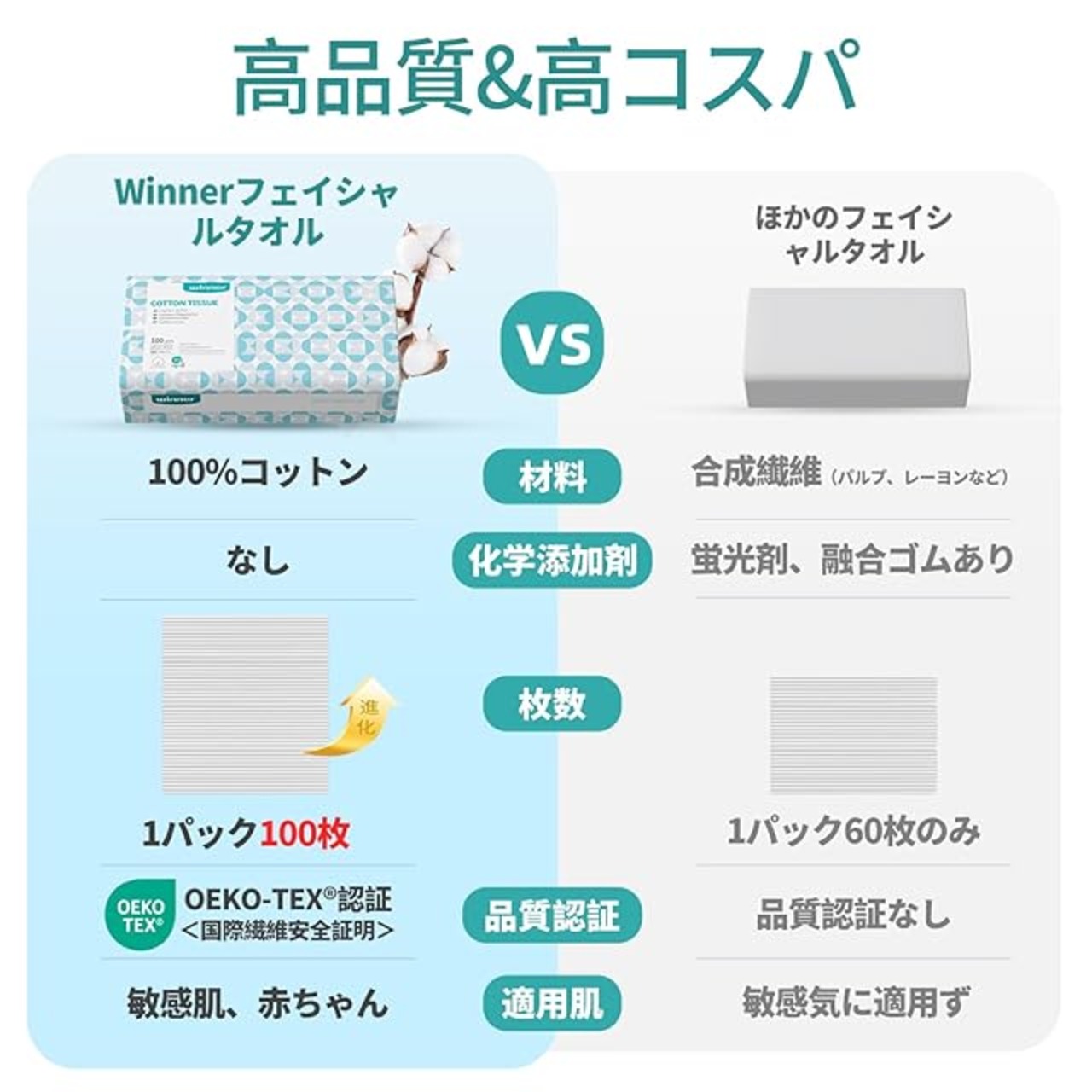 Winner フェイスタオル クレンジングタオル OEKO-TEX®認証 300枚入り(100枚×3個セット) 天然コットン ふきとり用 フェイスペーパー 毛羽立ちなし 使い捨て 手拭き 顔拭き メイク落とし 敏感肌用 乾湿両用 20x20cm