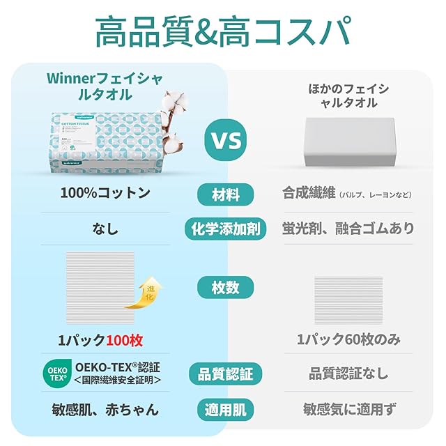 【柔らかい触感】サイズ: 20x20cm、内容量:100枚入×3個(計300枚) 。素材: 100%天然コットン素材のクレンジングタオルは、極上の柔らかさと肌に優しい質感が特徴です。敏感肌の方にもぴったりで、毎日のスキンケアが楽しみになります。