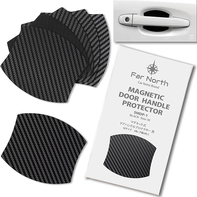 Far North ドアハンドルプロテクター 車用 【マグネット式】 多車種汎用型 車 傷防止 保護 ドアハンドル プロテクター カーボン ドアハンドルプロテクションカバー ドアノブ ガード 引っかき傷 保護フィルム マグネット 4枚+予備2枚入り (黒, Mサイズ 89×79mm)