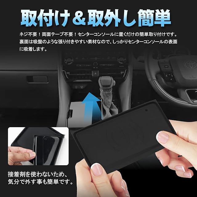 【取付け&取外し簡単】ネジ不要!両面テープ不要!センターコンソールに置くだけの簡単取り付けです。裏面は吸盤のような張り付きやすい素材なので、しっかりセンターコンソールの表面に吸着します。