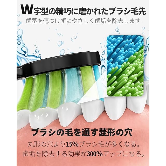 【6つの替えブラシ、「W」デザイン】替えるブラシヘッドを6個付属しているので、頻繁に交換用の電動はぶらしヘッドを注文する必要がありません。 毛先にはDUPONTナイロンを採用し、歯の形に合わせた「W」デザインで、歯ぐきや届きにくい部分を徹底的にクリーニングします。 注意:口腔内をやさしく扱っていただきます。 青いブラシ毛先の色が薄くなったら、ブラシヘッドを交換してください。 1つのブラシヘッドで3ヶ月間使用できて、6つのは約18ヶ月間使用できます。