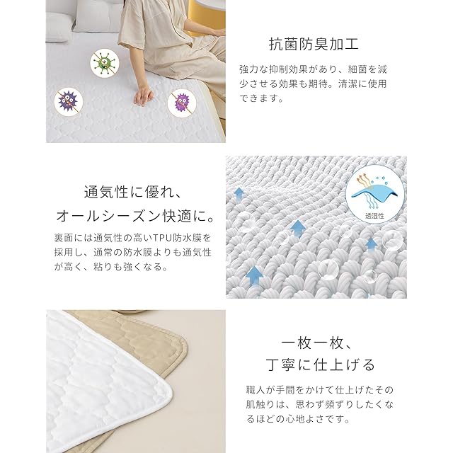 【吸水速乾・防ダニ・抗菌】Vallein防水シーツは、クッション性と保温性に優れた中綿を充填して、ふんわり心地よい寝心地を実現しました。洗濯機で丸洗いした後、従来品よりも短時間で乾きます。ダニの栄養分であるケア、アカ、湿気などをマットレスに溜め込まないため、ダニの繁殖を抑制します。一年中快適にお使いいただけます。