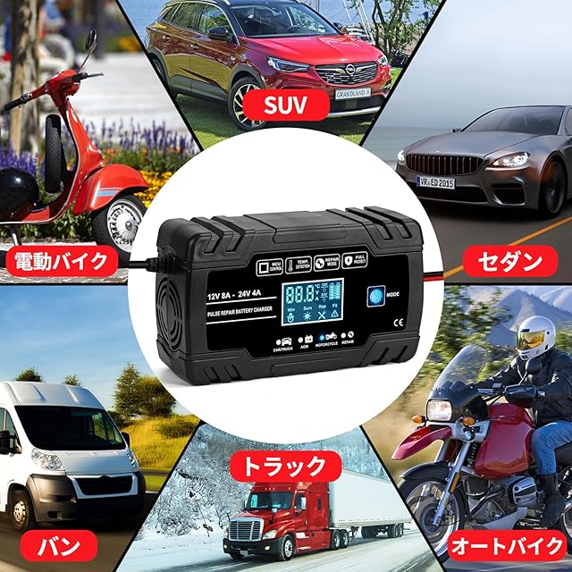 Seimituseizou 12Vと24V用鉛蓄バッテリー充電器 パルス充電器 全自動バッテリーチャージャー トリクル充電 修復充電器 1.5A/4A/8A充電電流 LCD表示 車/バイク/トラックなどに適用 日本語説明書