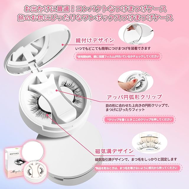 【シンプルな使い方】 マグネット つけまつ毛の使い方:1.ビューラーで自まつげをカールする、 まつげセッティング液をプライマーとして塗布し、自まつげの摩擦を高めます。2.磁気まつげをケースから取り出し、上下のまつげを端からそっと分離します。3.クリップを取り出します。取り付けるときは、まつげをクリップの内側に向け、上まつげ(濃密方)をクリップの上端(UP)に合わせる。磁気ストリップの突き出た面を外側に向けて、その反対側をクリップの磁気ストリップと接着する4.下まつげ(薄い方)をクリップの下端(DOWN)に合わせ、磁気ストリップの突き出た面を外側に向けて、その反対側をクリップの磁気ストリップと接着する。5.クリップの上下(UP/DOWN)方向に従って45度の角度で下を見て、クリップの上部をまつげの根元に近づけ、上下のクリップをゆっくりと引き寄せて閉じ、上下のまつげを吸い込んでから装着完了です。