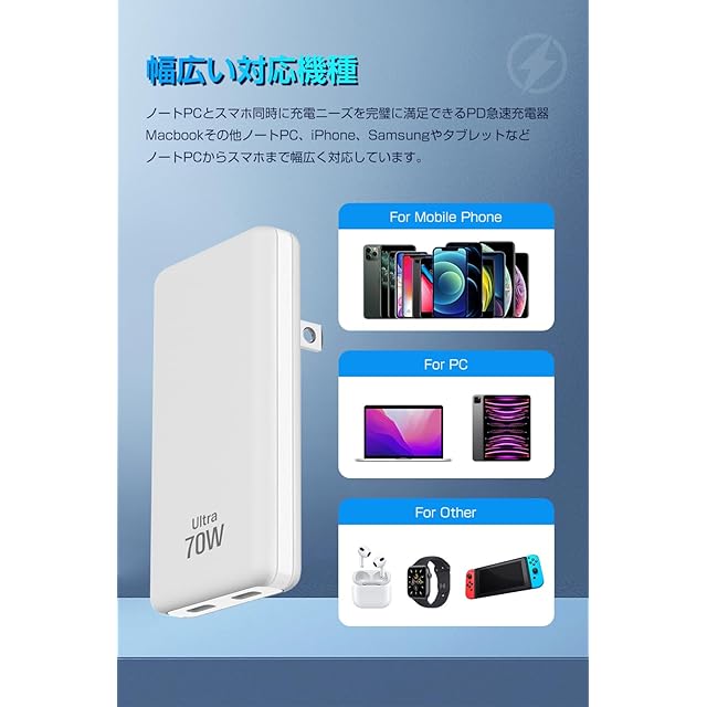 ⚡【単ポート最大70W出力】一般的な65W充電器から進化した70W高出力、MacBook Airにぴったりです。USB-C単ポート利用する場合が、MacBook Airに、わずか30分で最大50%まで充電できます。20V/3.5Aの圧倒的な急速充電スピートで、いつでもどこでも、あなたのノートPCがフルパワーで動作できます。