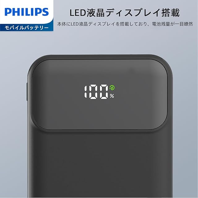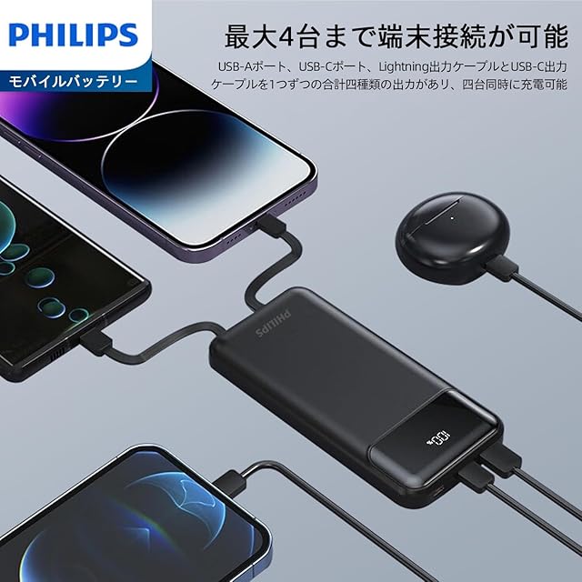 Philips (フィリップス) モバイルパッテリー 10000mAh大容量 ケーブル内蔵 PD&QC急速充電 四台同時充電 LED電量表示 スマホ充電器 PSE認証済 多種保護 持ち運びやすい DLP1912CB