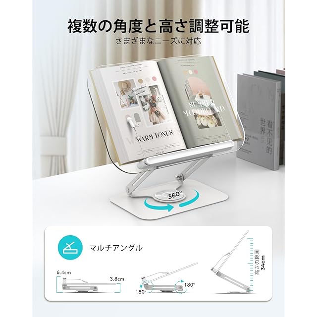 【調整&回転可能】ベースは円滑な360°の回転が可能で、最適な本の閲覧角度に調整するための便利さを提供します。ボード自体は約120度のスイング範囲があります。高さ調整範囲は3.5-34 cmで、本を視線に合わせます。首、肩、腰への負担を軽減するのに役立ちます。