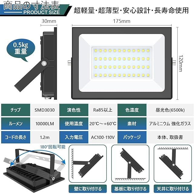 【コンパクト設計・IP66防水で屋外に設置可能】極薄型設計により厚さは僅か30㎜に加えて、0.5㎏を下回る軽量化を実現!従来のLED投光器と比べて、より軽量、より薄く、より取付簡単です。コンパクトで軽量の設計で取付の自由度が上がります。従来の明るさそのままに薄型ボディで従来の商品よりも設置場所が広がります!IP66高防水防塵仕様で、水などの浸入を有効に防がせ、屋外ウォール、アウトドアなど雨がよく降られ場所に取り付けても安心ご利用できます。車庫、庭、夜釣り、トンネル、ガレージ、工事現場、舞台照明、屋外照明、BBQ、ガソリンスタンド、夜間イベントなどに最適!