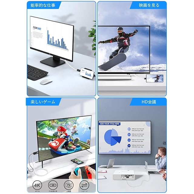【高性能チップ&遅延なし】この商品は高性能チップを採用し、高速で安定したデータ転送ができます。遅延なくテレビ画面でSwitchで遊べています。また、プラグアンドプレイです。ソフトウェアやドライバをインストールする必要がなく、接続するだけで手軽に利用できます。家でゲームのみでなく、映画観賞、会議室、会社勤務、発表会、展覧会などの場合にも大活躍です!