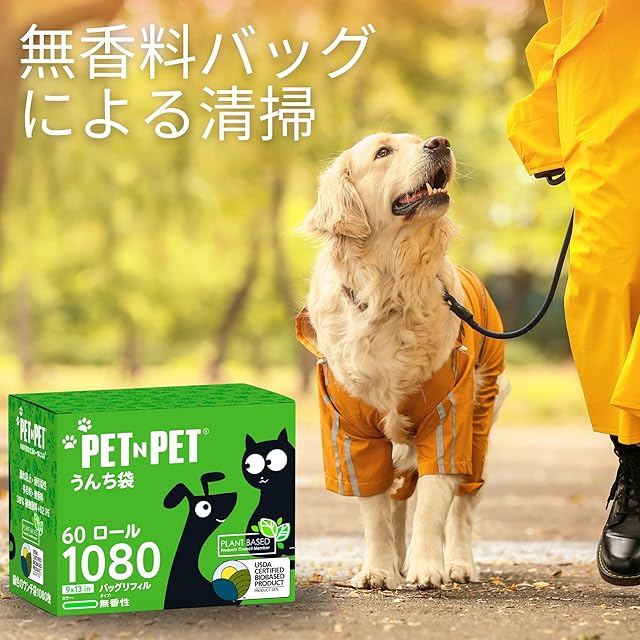 Pet N Pet うんち袋、エチケット袋、60ロール入り1080個、臭わない犬のうんち袋、犬の散歩用猫用トイレ袋、USDA認定 38% 植物由来 & 62% PE、漏れ防止で丈夫