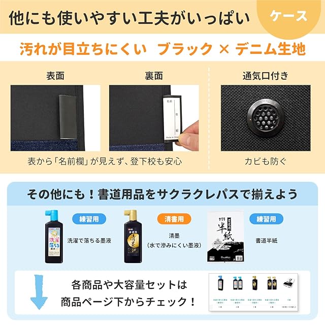 【内容】固形墨、墨汁(清墨180ml)、軽量両面硯(四五平)、太筆、細筆、筆巻(竹製)、文鎮(1本)、水差し、中皿(蓋付き)、筆置き、下敷き、書写セットの使い方、半紙ホルダー一体型バッグ(ショルダーベルト付き)