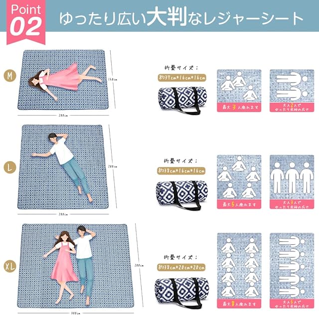 「大判レジャーシートの商品仕様と適用人数」:防水ピクニックシートは、7つのカラーと3つのサイズから選ぶことができます。①M商品重量(約)810g、展開サイズ(約):幅150cm×奥行200cm、 収納サイズ(約):37cm×16cm×16cm、適用人数:1~3人 ②L商品重量(約)1150g、 展開サイズ(約):幅200cm×奥行200cm、収納サイズ(約):38cm×16cm×16cm。適用人数:3~5人。 ③L商品重量(約)1700g、 展開サイズ(約):幅200cm×奥行300cm、収納サイズ(約):38cm×20cm×20cm。適用人数:5~8人。