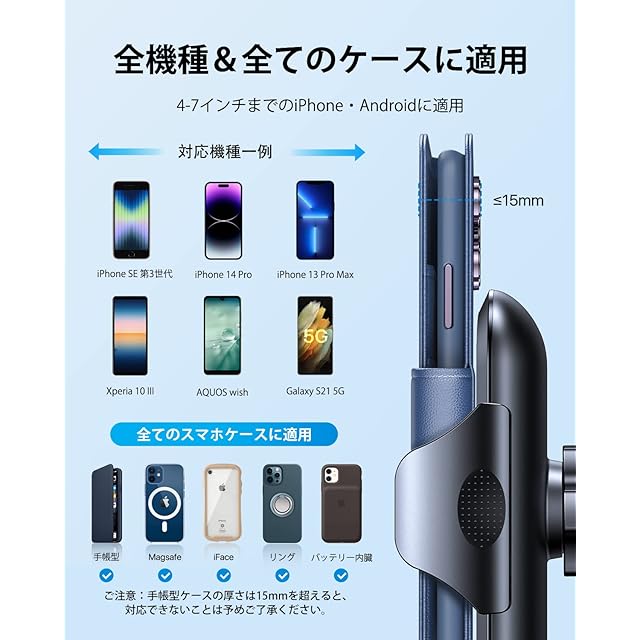 【手帳型ケースでも適応・適応機種&車種】Andobilの車載ホルダーはアームが5.48cmから10.21cmまで調節可能です。また、下支えもスライド式なので、iPhone/Xperia/AQUOS/Samsung Galaxy/OPPOなど4-7インチ大画面のスマホに対応できます。更に、ホードル力が高いため、例えスマホホルダーに手帳型ケースをつけたままでも安定感がしっかりあります。そして、クリップ式なので、適応車種には限りがあります。ご注意: ご購入の際は、メーターの幅と深さをチェックして、ご確認のうえお求めください。