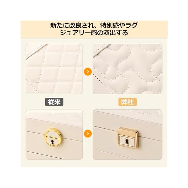 【ラグジュアリーな雰囲気を演出する上質な外観】アクセサリーボックスの外側は、繊細で滑らかな手触りの上質なレザーで作られており、防水性と耐摩擦性にも優れています。ユニークでラグジュアリーな雰囲気を演出する鍵付きのデザインで、鍵で開けると宝箱を開けるような感覚になります。