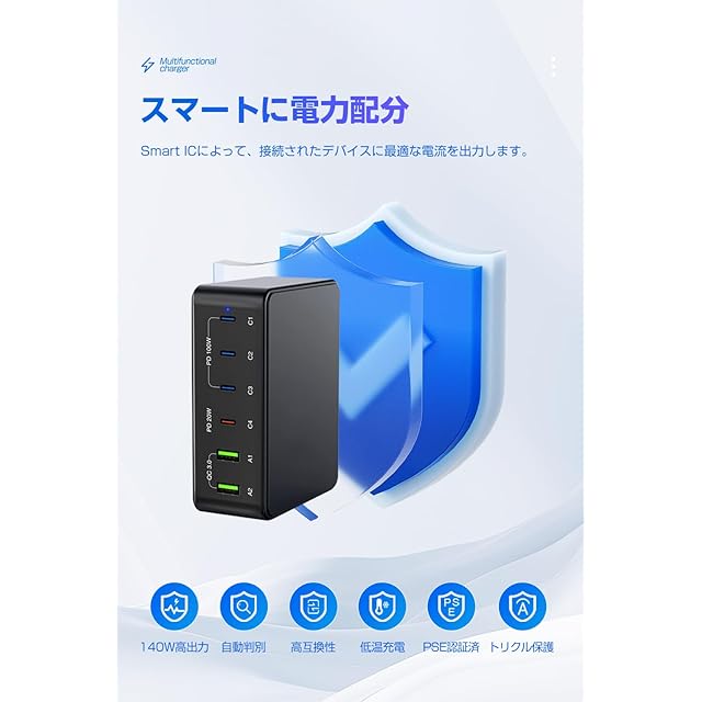 PD充電器 USB充電器 合計140W type-c急速充電器【PD 3.0、PPS、QC4+対応/6台同時充電/単ポート100W】USB-C*4&USB-A*2 スマホ PSE認証済み Macbook Pro/iPhone 15/14/Galaxy/AndroidノートPC スマートフォン タブレットなどその他機器対応(ホワイト)