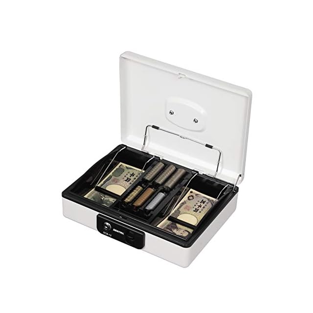 【使いやすい充実した機能】・刻みがついたコインカウンター付きで両サイドに紙幣も収納できる上段トレイ付き。※上段トレイは取り外し可能。・領収書や紙幣を挟める書類挟み付き。・軽くて丈夫な設計。キズが付きにくい粉体焼き付け塗装。・ワンタッチでフタが開くため店舗などでの忙しい現金管理に便利です。