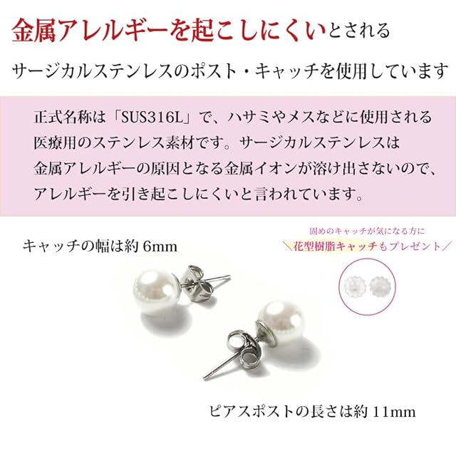 【使いやすいサイズとお買い得セット!】フォーマル な装いに合わせやすい 8mm パール珠を採用。ネックレスの長さはプリンセスサイズの42cm です。さらに同じパール珠を使用したピアスもセットに!またポスト・キャッチともに金属アレルギーを起こしにくいサージカルステンレスを採用。