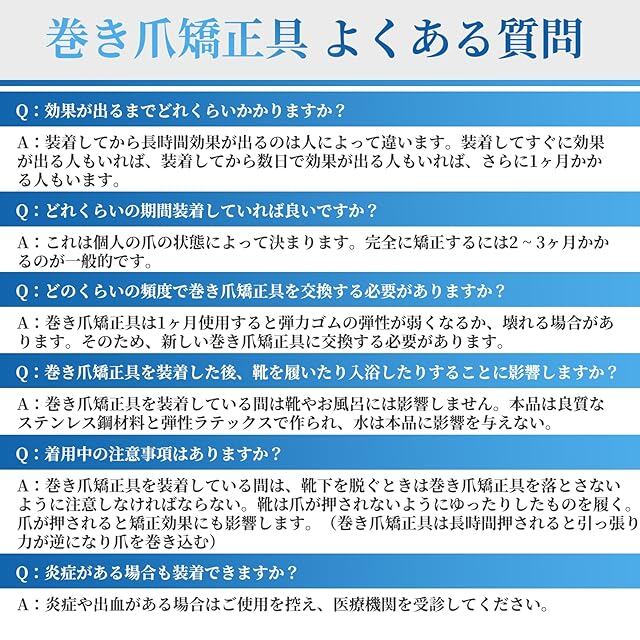 【有効期間】本品は約30日間使用すると、弾性ゴムの弾力性が低下しますので、新しい製品に交換するのはおすすめです。軽度に爪が陥入している方は、本品を1〜2ヶ月装着する必要があります。重度の方は、本品を2〜3ヶ月装着する必要があります。※個人の爪の状態によって決まります。