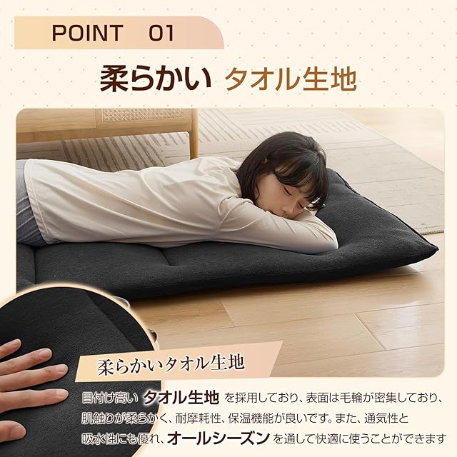 【柔らかいタオル生地&オールシーズン使える】目付け高いタオル生地を採用しており、普通の生地と比べるとはるかにさらっとした肌触り持っております。表面は毛輪が密集しており、肌触りが柔らかく、耐摩耗性、保温機能が良いです。目付けがアップグレードされ、さらに丈夫で破れにくいです。また、通気性と吸水性にも優れ、吸収した水分は外に発散されるので、オールシーズンを通して快適に使うことができます。ごろ寝マットはキルティング製になっていますので、型崩れしにくく丈夫です。