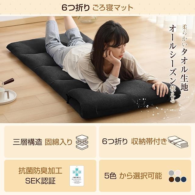 ごろ寝マット 6つ折りお昼寝マット タオル生地 長座布団 折りたたみごろ寝布団 ゴロ寝 ごろね おひるね ロングシートクッション コンパクト 休憩 車中泊マットレス ポータブル 畳める 固綿入り 体圧分散 五層構造 収納用のストラップ付き 70*180cm ブラック 折り目なしパッケージ