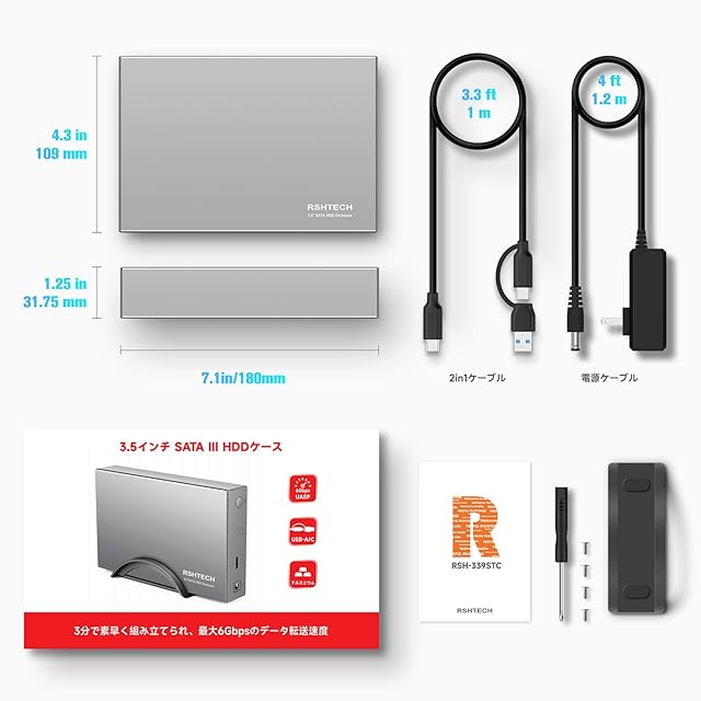 HDDケース 3.5インチ RSHTECH ハードディスクケースUASP対応 6Gbps高速転送速度 最大22TB 12V電源アダプター付属 アルミ製 SATA III対応 PC/Mac/PS4/Xbox等適用 HDD 外付けケース
