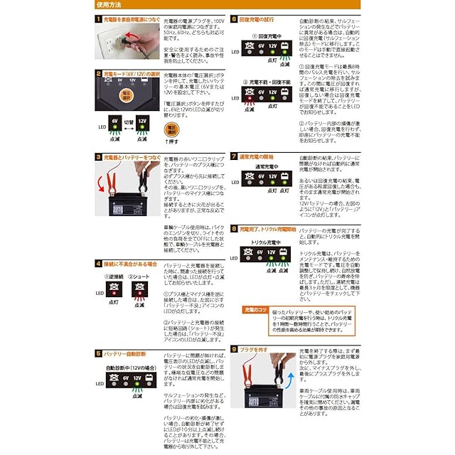通常充電終了後、自動でトリクル充電モードに移行します。冬の間も付けっ放しOK! ※連続充電は最大3ヶ月を限度の目安にしてください ※バッテリーの初期補充電は、通常より短時間で充電が完了します