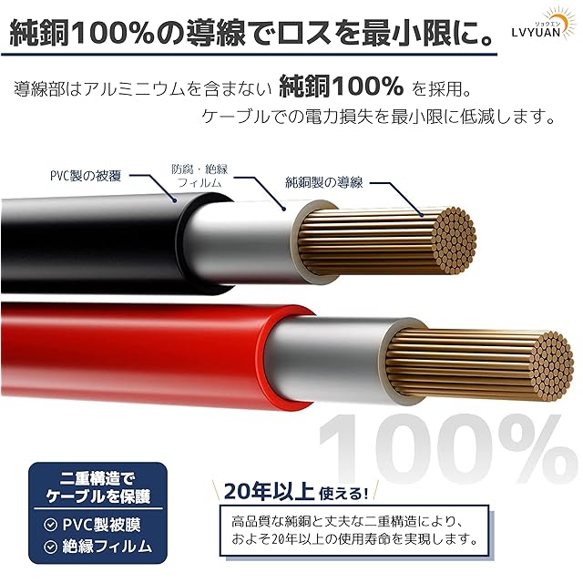 ◆【良質な素材】ソーラー充電ケーブルは、頑丈で耐久性のある11AWGの銅線と二重のPVCジャケットで製造されています。長さは約5メートルで、定格電圧は最大で1500V(DC)です。耐熱性も高く、-30℃から最高で90℃の高温にも対応しています。