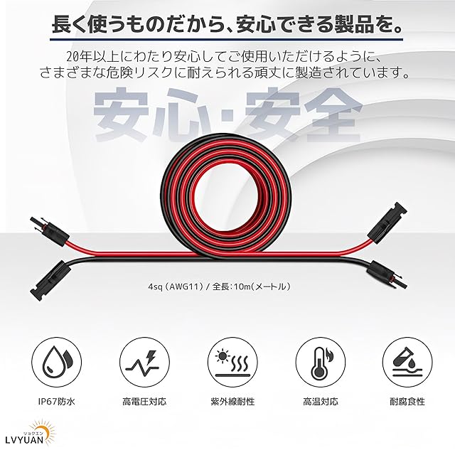 LVYUAN MC4 ソーラーケーブル 4sq 11AWG 長さ10m 最大電流約47A 最大電圧1500V(DC) ソーラー 延長 ケーブル ソーラーパネル接続用 コネクタ付きソーラー用ケーブル MC4コネクター ソーラーコネクター 2本セット(赤線10m+黒線10m)