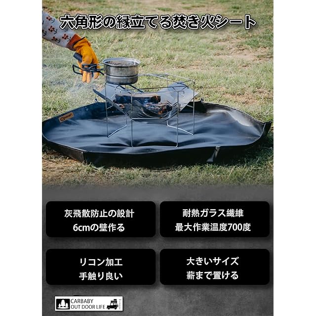 CARBABY 焚き火シート スパッタシート 防炎シート 焚き火台シート 六角形 ブラック 縁立てる 耐火 耐熱 芝生保護 キャンプ 瞬間使用温度:1500℃まで サイズ:105×105cm 収納袋付
