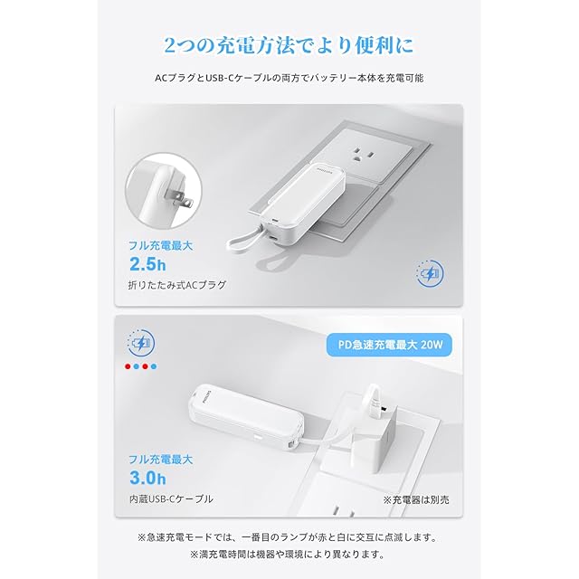 【折畳式ACプラグ&2つの充電方法】折りたたみ式の電源プラグを装備し、開いた状態ではコンセントに差し込んで充電器として使用でき、収納すればモバイル充電器として使用できます。そして、PD急速充電対応最大 20Wの入出力用USB-Cケーブルも内蔵で、約3時間でフル充電可能です。電源ボタンの上はLEDインジケーターを搭載し、バッテリー残量が一目瞭然でわかるので安心できます。