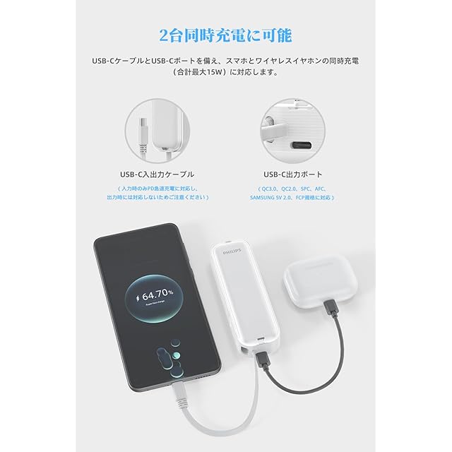 Philips (フィリップス) 小型 モバイルバッテリー コンセント一体型 5000mAh 大容量 入出力USB-Cケーブル内蔵 PD急速充電 軽量 二台同時充電 ACプラグ付 低電流充電対応 モバイル充電器 パススルー機能 PSE認証済 ホワイト DLP5201CW