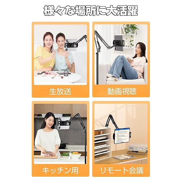 【フロアスタンド・両手解放】本製品は伸縮で高度を調節できるフロアスタンドです。場所を選ばず使える床置きタイプ、寝ながら使用することができます。なお、アーム部分を自由に曲がって、お好みの高度を調節し、俯いてスマホを見続ける首の凝り、ストレートネック防止になり、自撮影/動画視聴/リモート会議/動画撮影などの場所に大活躍です。