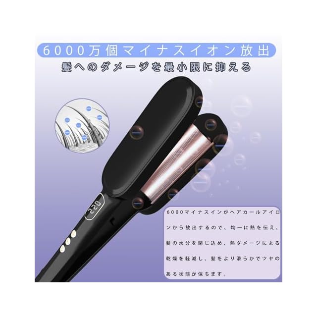 ✅【千万級マイナスイオン放出・精油配合セラミックコーティング】カールアイロンから放出される千万級マイナスイオンが静電気を抑え、髪の水分をキープしながらダメージを軽減。潤いとツヤのある、なめらかな美しい髪へと導きます。従来品よりも摩擦を大幅に軽減する特殊な精油配合の水性セラミックコーティングを採用。滑らかな使用感と高い保湿力で水分の蒸発を抑え、美しい髪へと導きます。髪内部の潤いを守りながら精油成分を放出し、艶やかなストレートヘアを長時間キープします。
