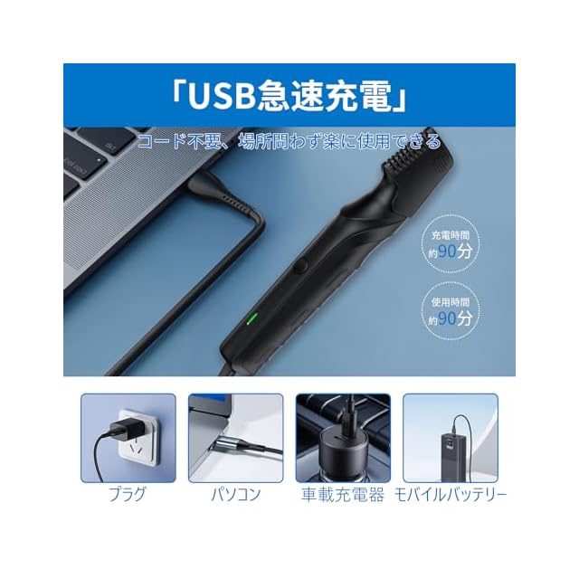 【USB急速充電&コンパクト持ち運びやすい】-弊社のボディシェーバーにはUSB充電ケープルが付き、便利な急速充電は実現できます。約90分で満充電となり、約90分間連続使用できます。本体の重量はただ0.362キロで、サイズが13cm * 5.2cm * 23.3cmで超小型です。自宅だけでなく、職場や出張、旅行先でも、どこにでも持ち運びができます。