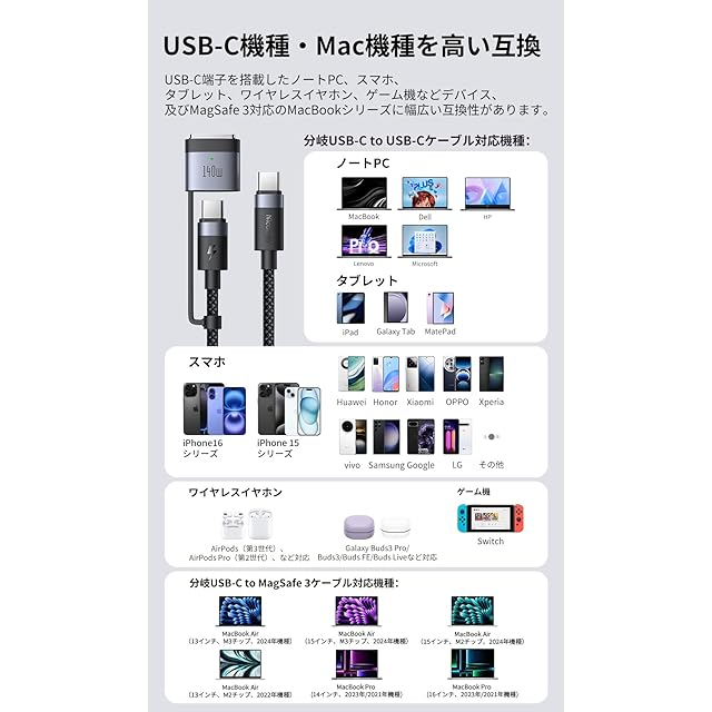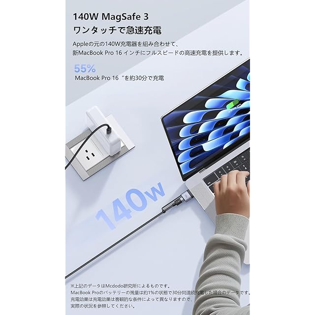 【240W / 140W USB-C to USB-C & Mag-safe 3 磁気充電ケーブル】:新しいフォルム、デュアルインターフェース。充電大満足。140W MagSafe 3 磁気充電ケーブル、240W USB-C to USB-C ケーブル。PD3.1 急速充電新規格を対応し、且つE-Markerチップを搭載して、最大140Wの出力でMacBook Pro 16“を約30分で55% まで充電します。ワンタッチで吸着、瞬間に急速充電。【Mac機種を互換】:MacBook Air(M2チップ、2022年機種)、MacBook Pro 14”(2021年/2023年機種)、MacBook Pro 16“(2021年/2023年機種)などMacの機種を対応します。本2in1急速充電ケーブルは、MacBook Pro/Air、iPad Pro/Air、iPhone 16/15シリーズ、Xperia/Galaxy/AndroidなどUSB-C機器を対応します。