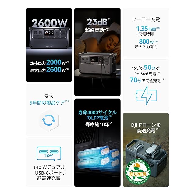 [リン酸鉄リチウムイオン電池で安心・長寿命] - 電気自動車にも採用されるLFPバッテリーを搭載。サイクル寿命4000回、約10年間使用可能で、過電流や過電圧から機器を守ります。さらに、日本の電源防災安全認証も取得しており、製品の信頼性と安全性が一層保証されています。これにより、地震や停電発生時においても安心して使用できます。
