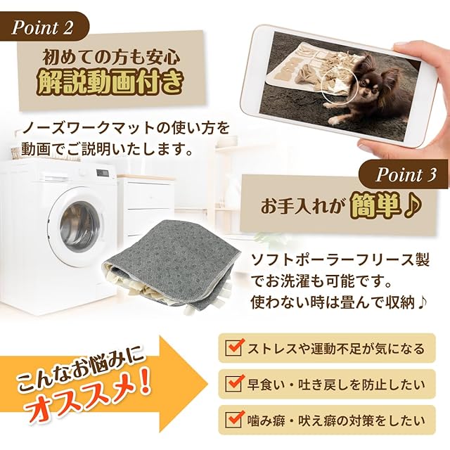 ✅【ノーズワークマットとは】ワンちゃんの臭いを嗅ぐという生まれ持った本能を満たしながら遊べるおもちゃです。ワンちゃんは嗅覚を使い様々な仕掛けに隠されたおやつを見つけていくことで、達成感を感じ夢中になって楽しみながら自信を育んでいくことができます。ノーズワークマットを利用することで、ワンちゃんの頭や心を満たし、心身のエクササイズ、意欲の向上などメリットがたくさんあります。