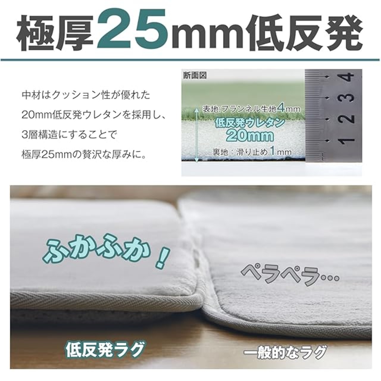 【低反発ラグマット】厚さ約25㎜の低反発ウレタンは、踏み心地がすごくふんわりして、底付き感を感じずゆったりリラックスします。体圧をバランス分散し、長時間座っていても疲れにくい。防音効果も抜群で、小さなお子様やペットが走り回っても大丈夫です。