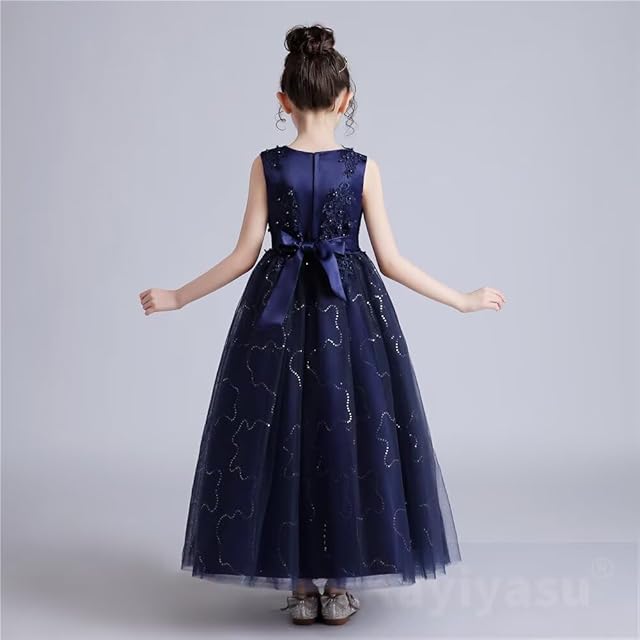 [Kayiyasu] 子供ドレス ピアノ 発表会 女の子 フォーマル ロングドレス 結婚式 卒業式 パーティー 刺繍 入園式 120-170 3-13歳に適合 (ネイビー, 150)