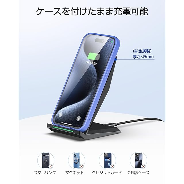 ケースつけのままでも:スマホに厚さ5mm(iPhone16/15/14/13/12シリーズが3mm)以下の非金属製のスマホケースを付けても、このまま置くだけで充電可能です。(お薦め:本製品はFOD異物検査機能を搭載しています。スマホケース以外の金属製、磁気を帯びる飾りや、クレジットカードを付けた場合、充電前に取り外して下さいますようお願い致します)